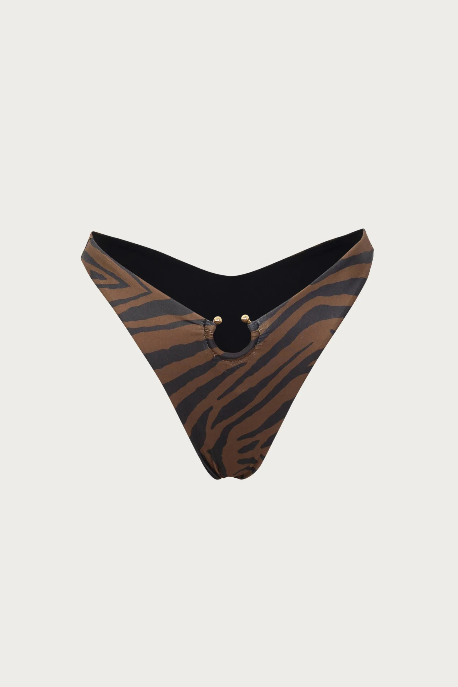 A modern take on a retro staple featuring a v waistline high-rise silhouette embellished with gold hardware, high cut and just-right cheeky coverage.