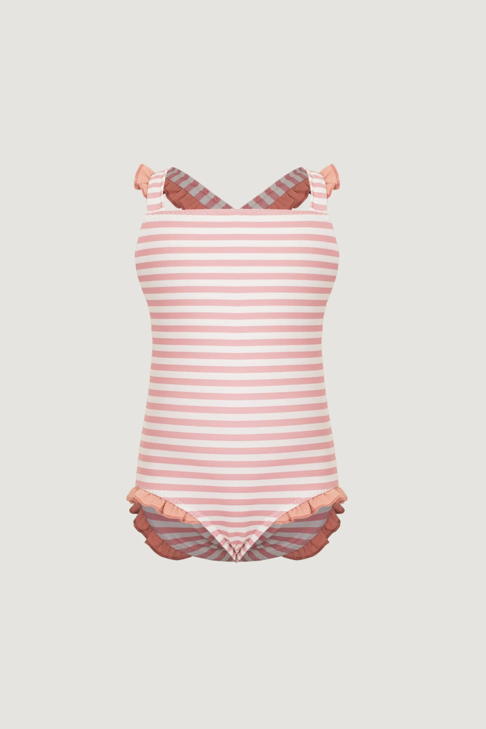 The ruffle one piece has a square neck with ruffles attached to the straps. that cross over the back and tie for the perfect fit. Features ruffles on shoulder straps and leg opening.