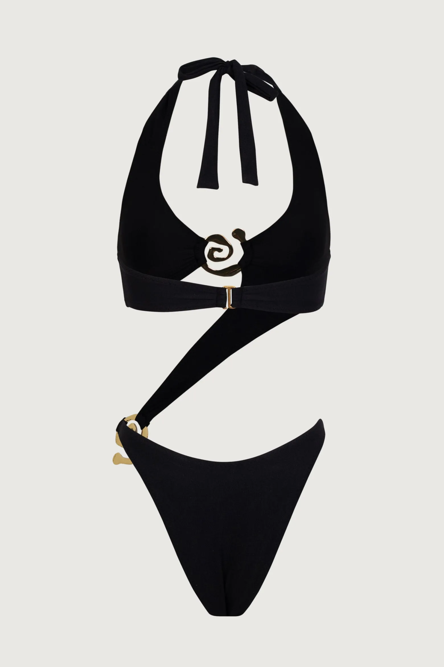 The Spiral One Piece featuring our custom gold spiral hardware and adjustable halter neck ties.
