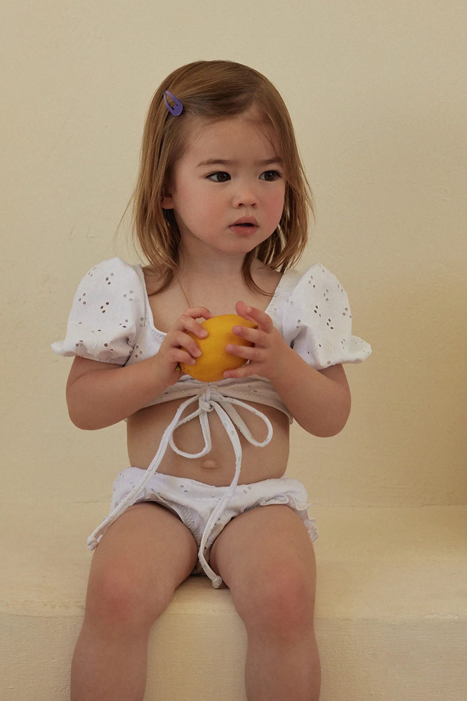 The swim bloomers has an elasticizes waist and fits over a swim diaper. Mix and match with the rashguard of your choice….