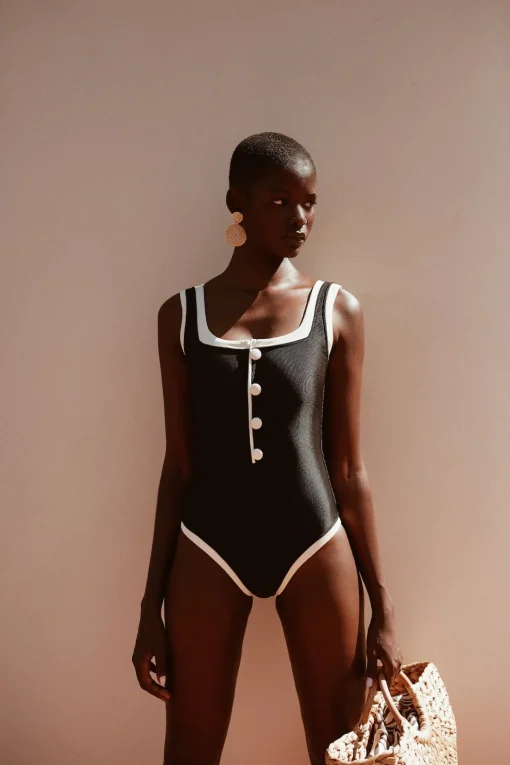 A modern take on a vintage one-piece in a cream ribbed knit with black trim featuring front zip closure and cheeky co…
