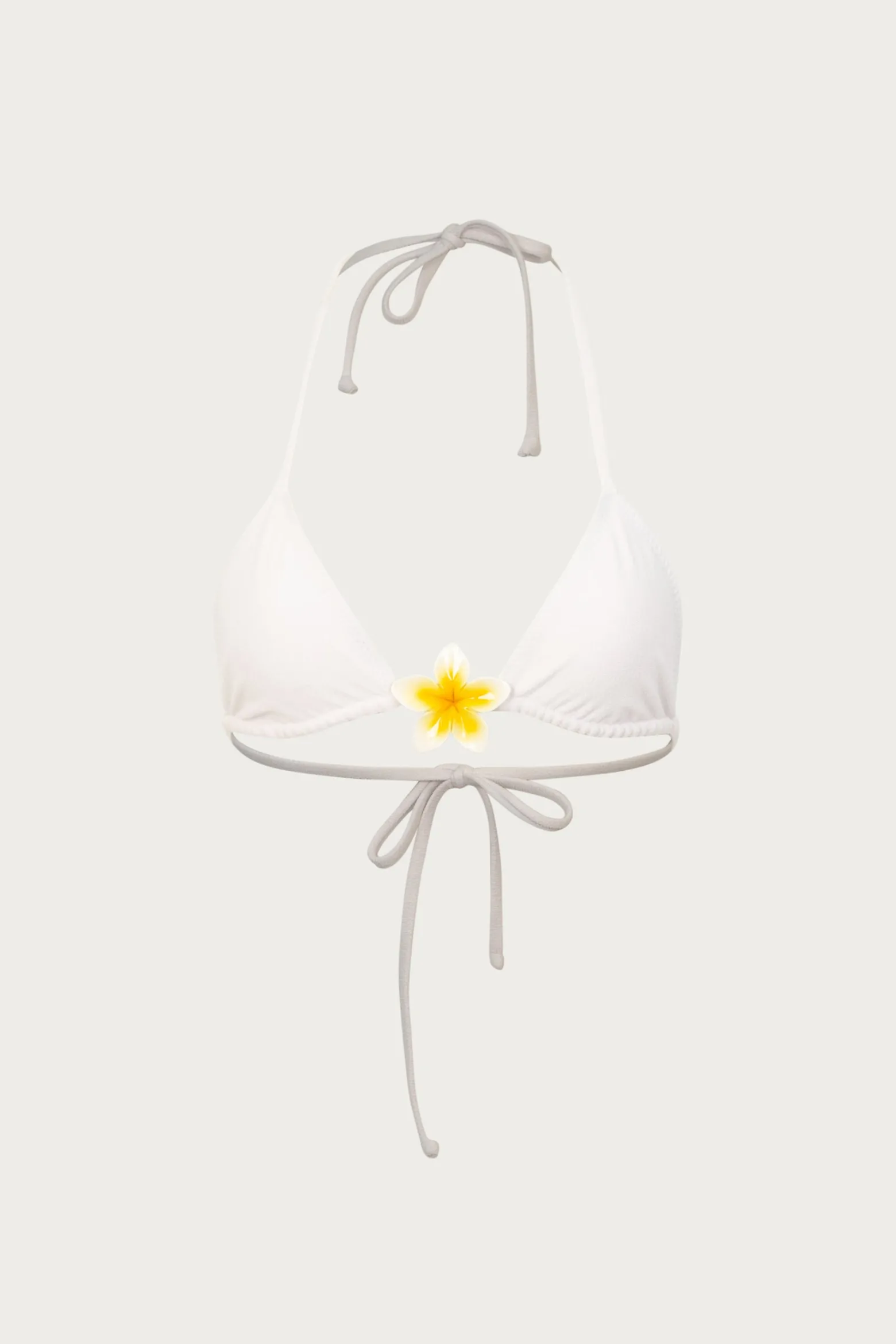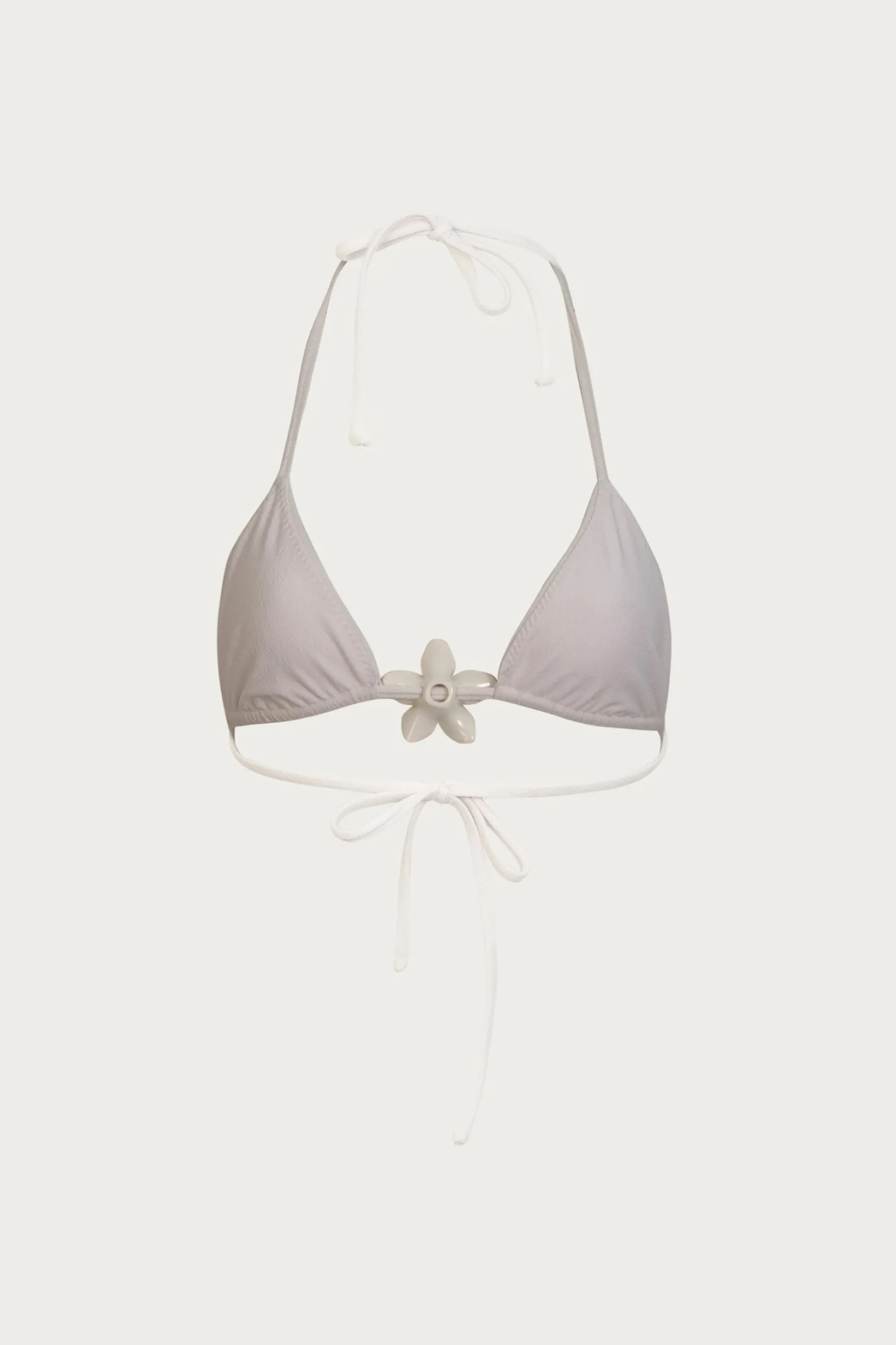 The Island Top is our take on the classic triangle silhouette, crafted in soft faux suede for a luxe feel against the skin. A custom sculpted flower detail sits at center front, adding a fun and stand out element. With adjustable ties at the neck and back, the fit is completely customizable.