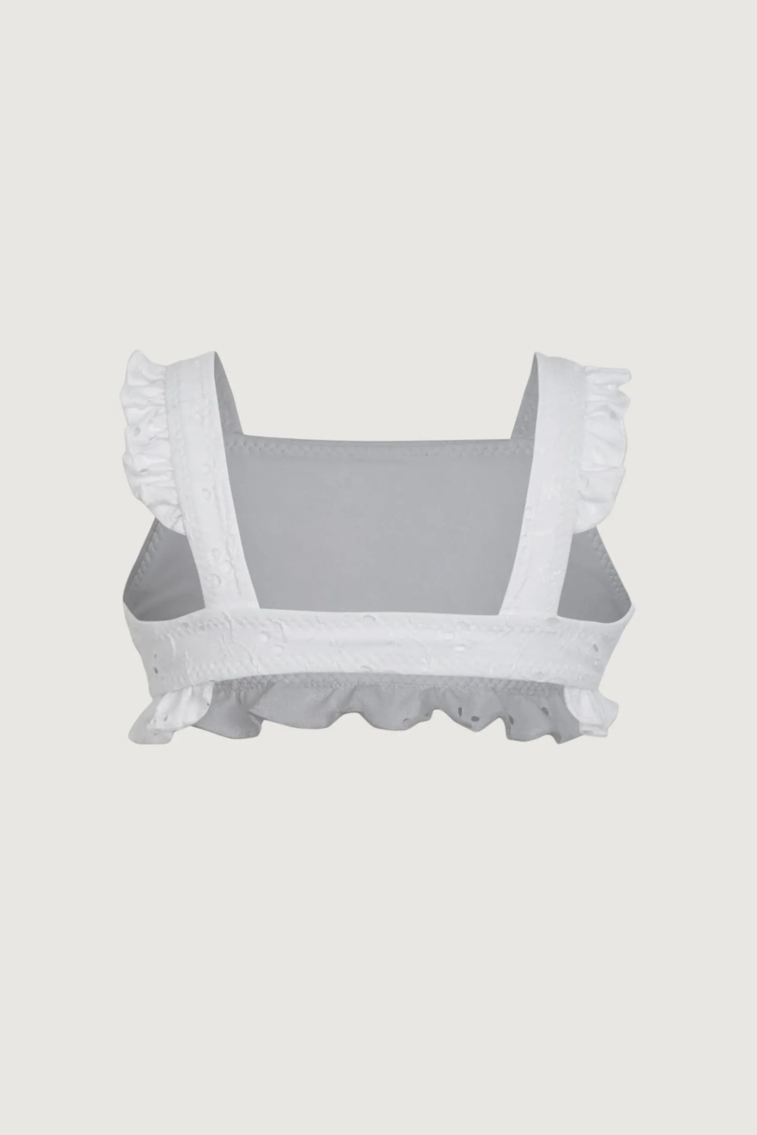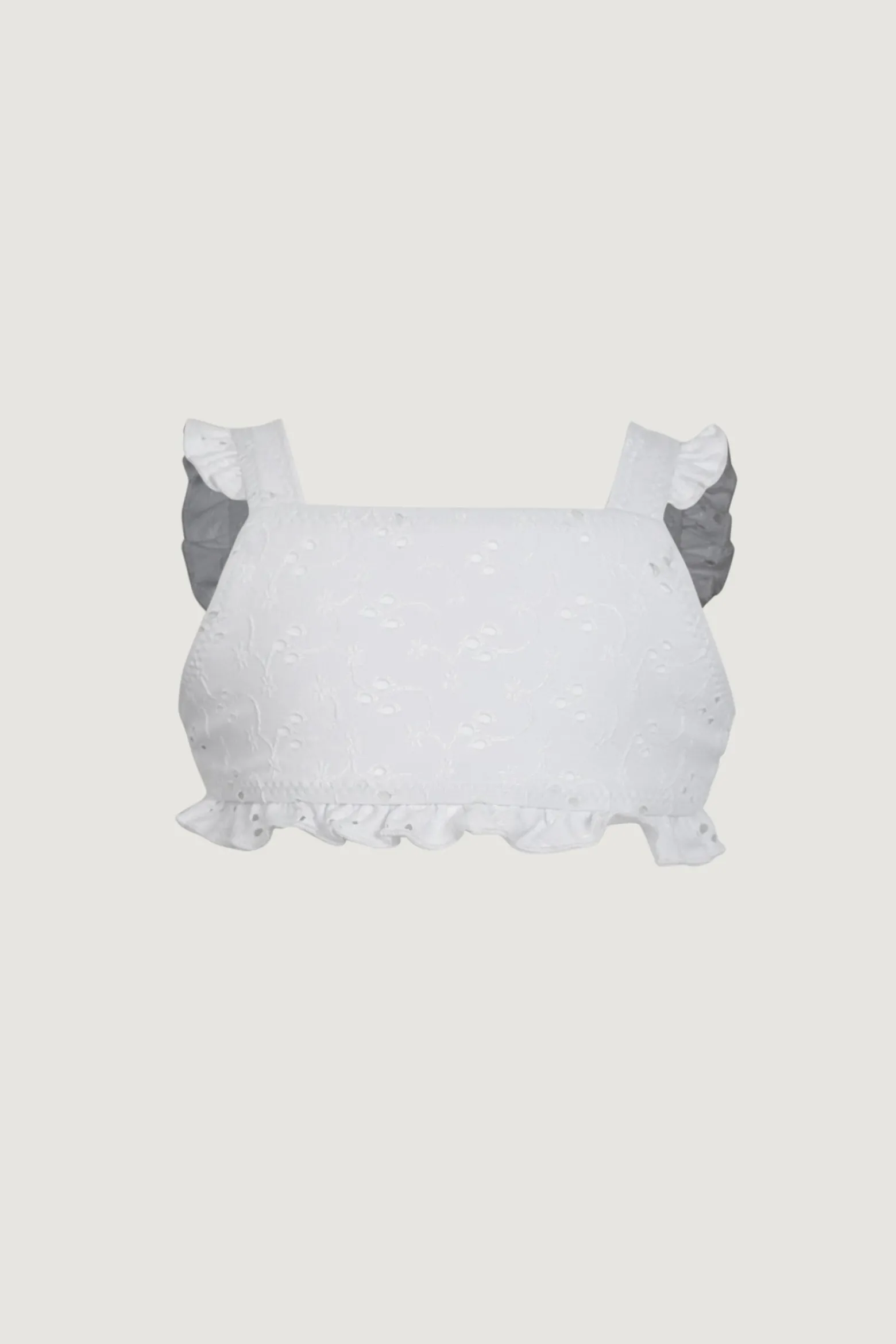 The ruffle bandeau top has a square neck with ruffle cap sleeves on the straps.