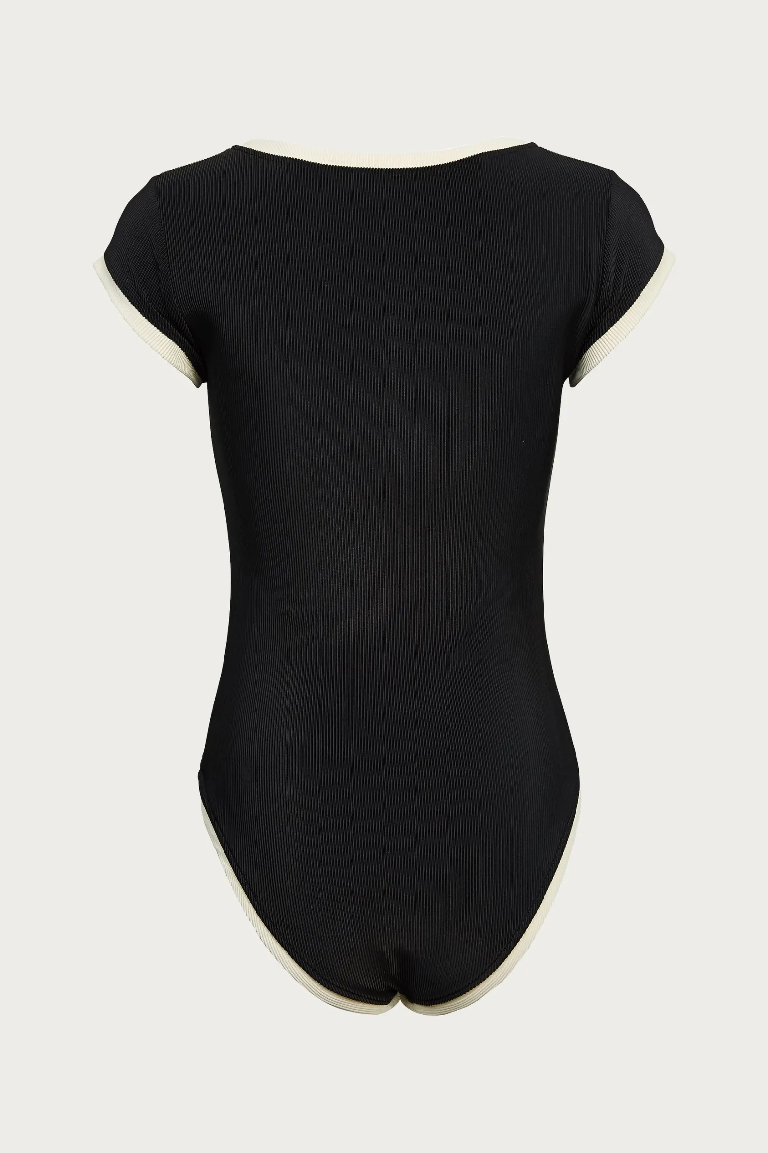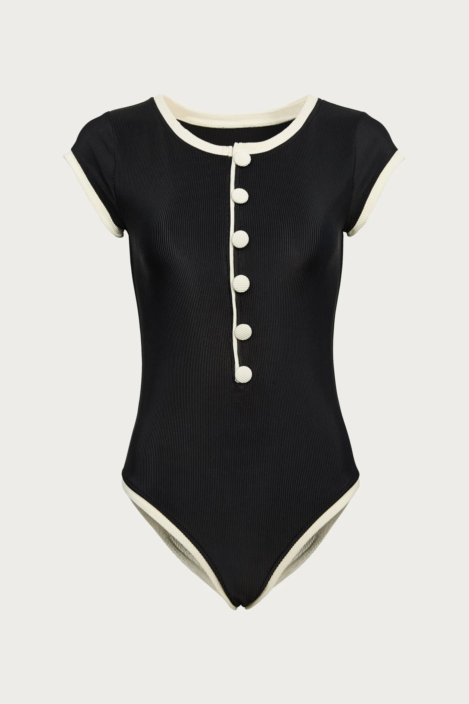 A modern take on a vintage one-piece in a black ribbed knit with cream trim featuring front zip closure and cheeky coverage.