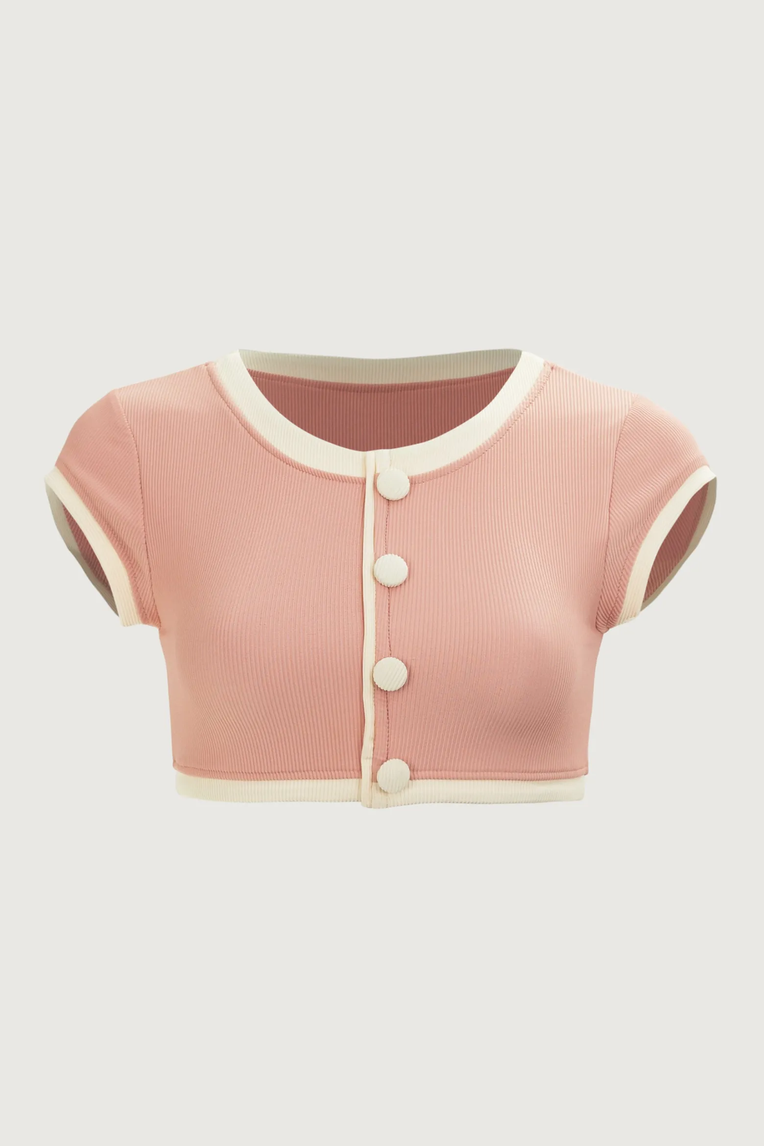 The Grace Top is a modern take on vintage swimwear with contrasting trim and a button front.